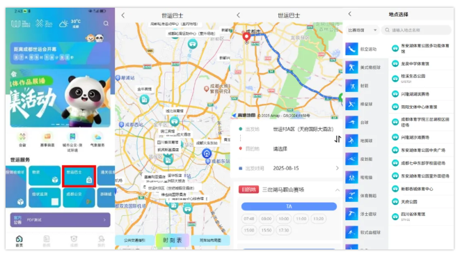 为了给运动员、随团官员、媒体等赛事相关人员出行提供方便,本次世运会交通保障还提供交通信息服务。通过大会官方世运通APP的“世运巴士”板块,出行人员可以一键查询线路,获取班车时刻、公共交通指引等信息。此外,还可以通过终点站搜索,或按赛事场馆、站点类别(如世运村、开闭幕式等)快速筛选,精准匹配最优线路。